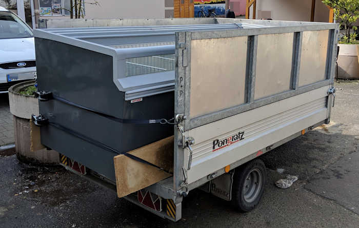 Den Transport hatten wir deshalb so lange vor uns hergeschoben, weil die Truhen einerseits sehr groß und mit deutlich über 200kg auch nicht gerade leicht sind. Die bewegt man nicht mal eben zu zweit und stellt sie auf den Anhänger, der ohnehin etwas zu kurz dafür ist. Aber ich wollte die Baustelle erledigt wissen und so haben wir mit sechs starken Leuten die Truhen auf den Anhänger gestellt, gegen Verrutschen und Herausfallen gesichert und in Findorff wieder abgeladen. Erst die eine, dann die andere. War zwar etwas Fahrerei, aber unterm Strich hat es doch relativ zügig geklappt und war deutlich weniger mühsam, als ich zunächst befürchtet hatte.