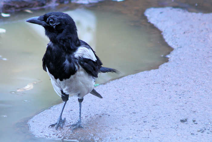 Seit ein paar Wochen haben wir eine Elster auf dem Hof. Der Größe nach ein eher jüngeres Tier, das insgesamt ziemlich zerrupft aussieht. Das Gefieder und die Flügel wirken gar nicht so schön glatt, sondern sehr ungepflegt. Fliegen kann sie jedoch, wie sie täglich mit Wegen auf die umliegenden Dächer beweist.