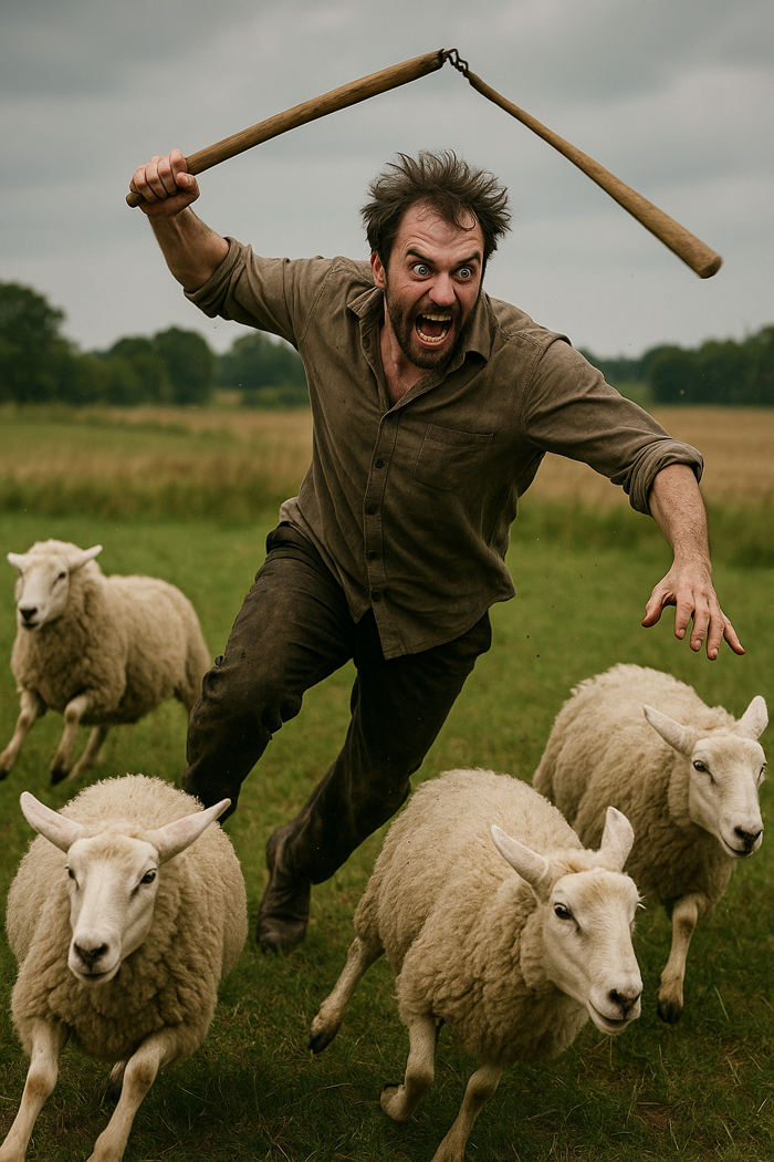 War gar nicht so leicht, ChatGPT das Bild so zu entlocken. Gewalt /-verherrlichende Darstellungen widersprechen den Richtlinien und ein Mann, der wütend mit einem Dreschflegel auf ein paar arme Mähs, äh, Schafe eindrischt, erforderte etwas Prompt-Bastelei. Aber letztendlich hat es ja geklappt: