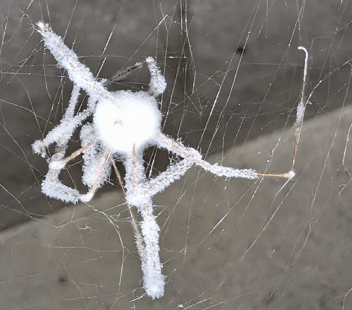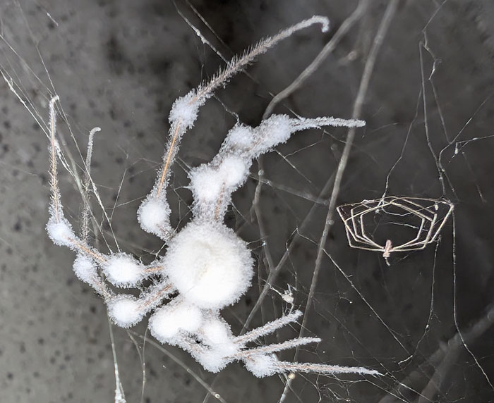 Kurz: Durch Feuchtigkeit vermehren sich Schimmelpilze besonders gut und diese Spinnen sind für bestimmte Pilze besonders anfällig. Solange sie sich häuten können, fällt der Pilz mit ab, aber sobald die Spinnen ausgewachsen sind, ist ihr Schicksal besiegelt – bis sie wie eine eingewickelte Mumie in ihren Netzen baumeln. Bei allen Spinnenphobikern könnte so eine Begegnung noch einmal richtig kicken.