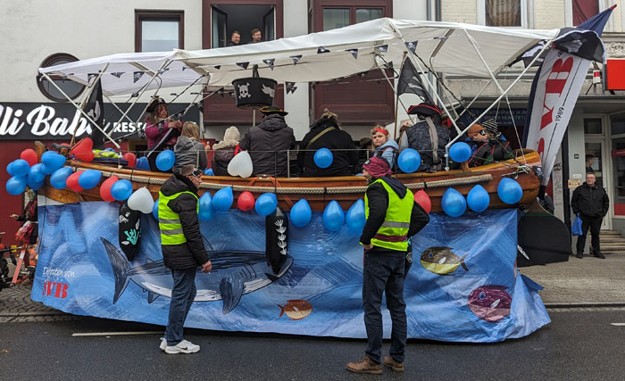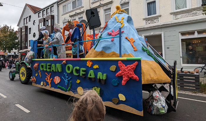 Dieser sehr aufwändig dekorierte Halloween-Wagen, über dessen Urheber gar nichts zu finden war, stand fast den ganzen Vormittag hier vorm Laden, hat erfreulich wenig Lärm gemacht und hat sich als eines der letzten Fahrzeuge in den Treck eingereiht.