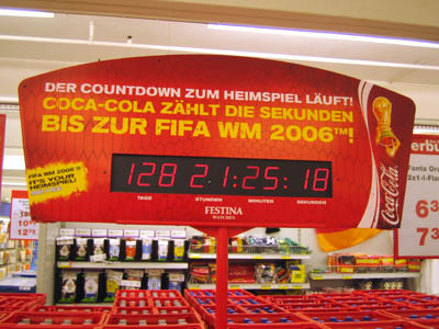 Bei der METRO (Achtung! Neue Öffnungszeiten: Wochentags bis 21:30 Uhr und Samstags bis 19:30 Uhr!) habe ich eine auffällige Coca-Cola-Präsentation gesehen: Auf einem riesigen Schild lief ein LED-Countdown bis zum offiziellen Anpfiff der Fußball-WM 2006. (Bitte nicht nachrechnen, das Foto ist Dienstag Abend entstanden!