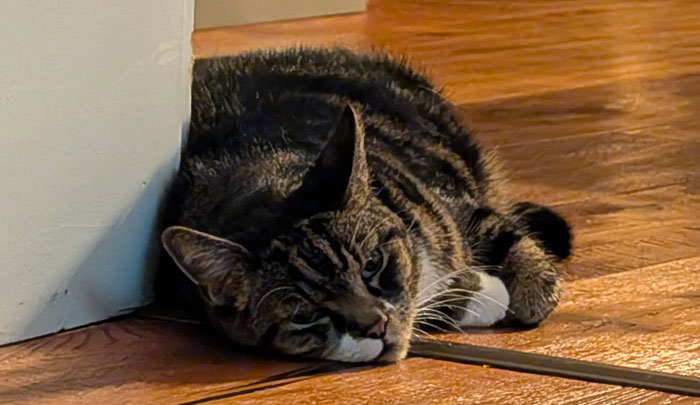 Katzen, liegen immer irgendwo herum … Hier leider aus reiner Erschöpfung Mitte Dezember 2025, wenige Tage bevor wir die Diagnose mit den beiden Nierenlymphomen im Endstadium bekommen hatten. Zum dem Zeitpunkt hatte Eddie nur noch wenig gefressen, ob aus Appetitlosigkeit, Übelkeit oder wegen Schmerzen aufgrund der entzündeten Stellen im Mäulchen werden wir wohl nie erfahren.