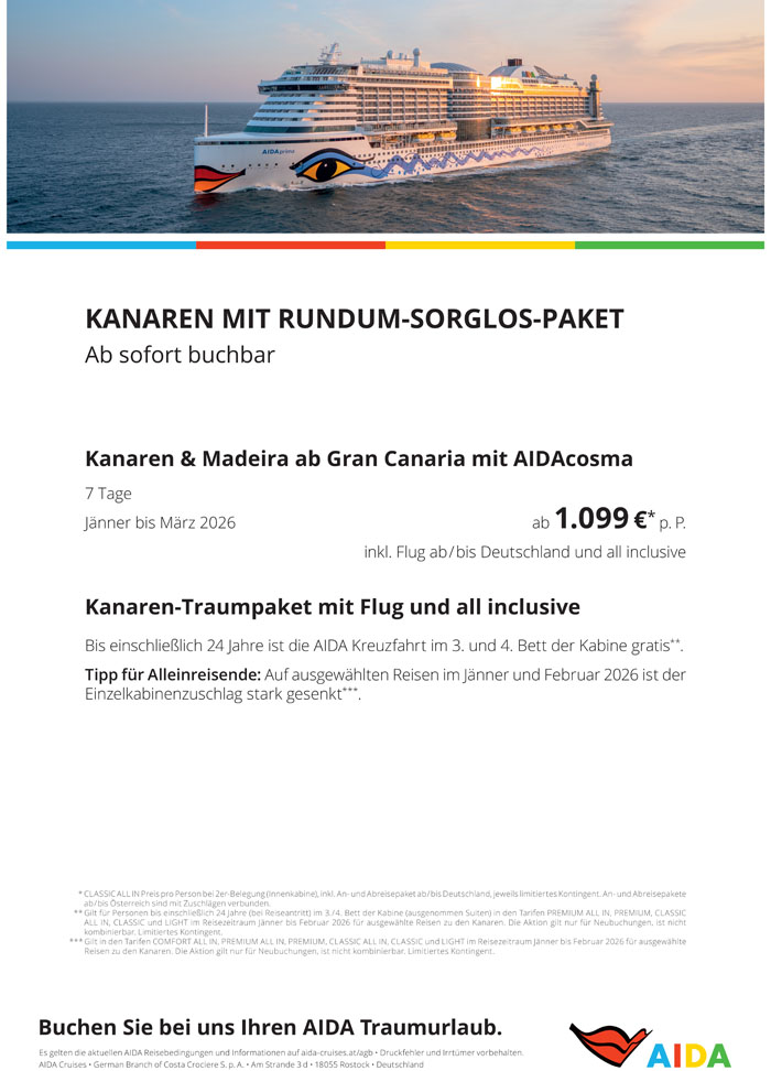 Ab sofort buchbar und gültig bis das Kontingent an Kabinen für dieses Angebot aufgebraucht ist: Eine Woche kanarische Inseln mit Madeira ab 1099 Euro pro Person inklusive Flug.