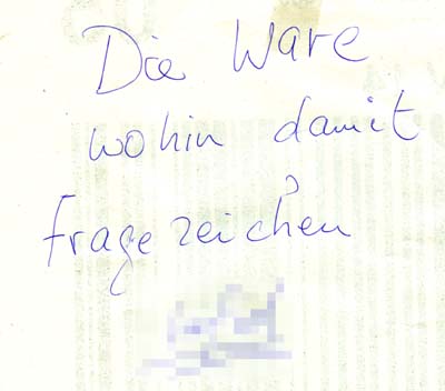 Eine Kollegin gab die Anweisung an einen anderen Mitarbeiter weiter, an Restware einen Zettel mit der Frage, wo die Ware hin soll, zu hängen. Ich befürchte, das scherzhaft von ihr mit ausgesprochene "Fragezeichen" wurde geringfügig missverstanden...