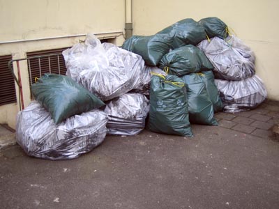 Ursprünglich habe ich das Gesamtgewicht auf 200 oder großzügig sogar 250kg geschätzt. Ich vermute aber, dass es doch einiges mehr sein dürfte: Einer der großen Säcke wiegt schätzungsweise 25kg und in den blauen Müllsäcken stecken jeweils rund 15kg.