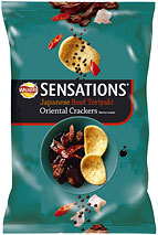 Von den Walkers Crisps kann ich eine neue Sorte bekommen: Sensations Japanese Beef Teriyaki. Dabei handelt es sich um ein Extruderprodukt aus überwiegend Maniok.
