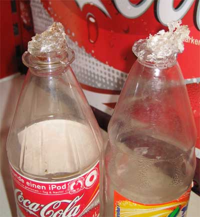 Da die Mehrwegflaschen von Coca-Cola -wie der Name ja nun schon vermuten lässt- mehrfach verwendet werden, müssen sie unbeschädigt wieder abgegeben werden. Eine Glasflasche würde ja auch niemand annehmen, wenn sie in mehrere Teile zerbrochen ist und genauso wie ein Haufen Scherben lassen sich diese beiden Flaschen wiederbefüllen: