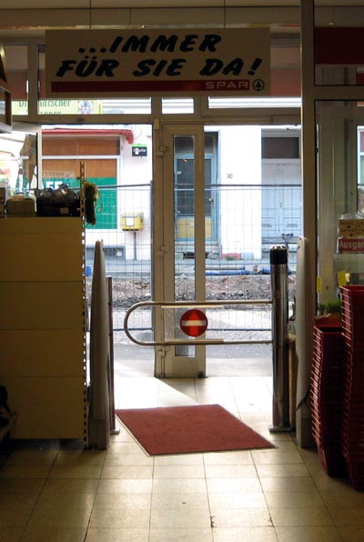 Der über zwei Meter breite Gehweg zwischen Tür und dem Bauzaun fällt aus der Distanz gar nicht auf und so sieht es tatsächlich ao aus, als hätte jemand meinen Laden schlicht und einfach mit einem Zaun versperrt.