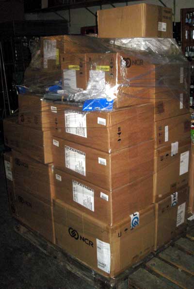 Jetzt geht es hier Knall auf Fall, wie man so schön sagt. Erst ein einzelner PC und nun wurde gleich eine ganze Europalette voller Kassenhardware geliefert: Drucker, Monitore, USVs, PCs, Kassenschubladen und was weiß ich nicht noch alles an Material... Zusammen jedenfalls ein echt beeindruckender Haufen: