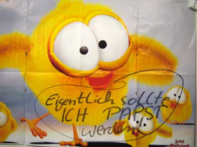 Zu Ihrer Bild-Idee: wie wäre es, wenn wir Herrn Papst Ratzinger überreden könnten, in das Küken-Kostüm zu schlüpfen und wild, wie eben das Küken im Spot selbst, herumtanzen zu lassen? "I maybe small" *tadelda*