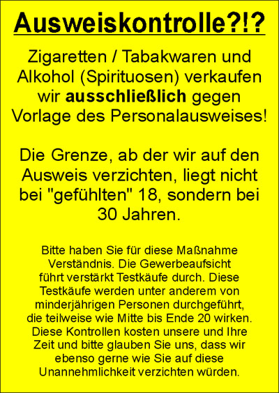 Da tatsächlich Kontrollen durchgeführt werden – und zwar mit minderjährigen Testkäufern, die aber teilweise schon problemlos als Mitte Zwanzig durchgehen – habe ich hier eine etwas merkwürdig anmutende Anweisung herausgegeben. Die Zettel hängen inzwischen seit einigen Wochen an der Kasse. In der Anfangszeit (und auch heute noch) gab es viele lange Gesichter, aber was soll's...