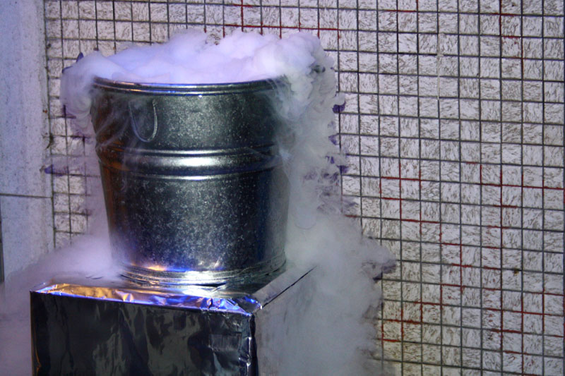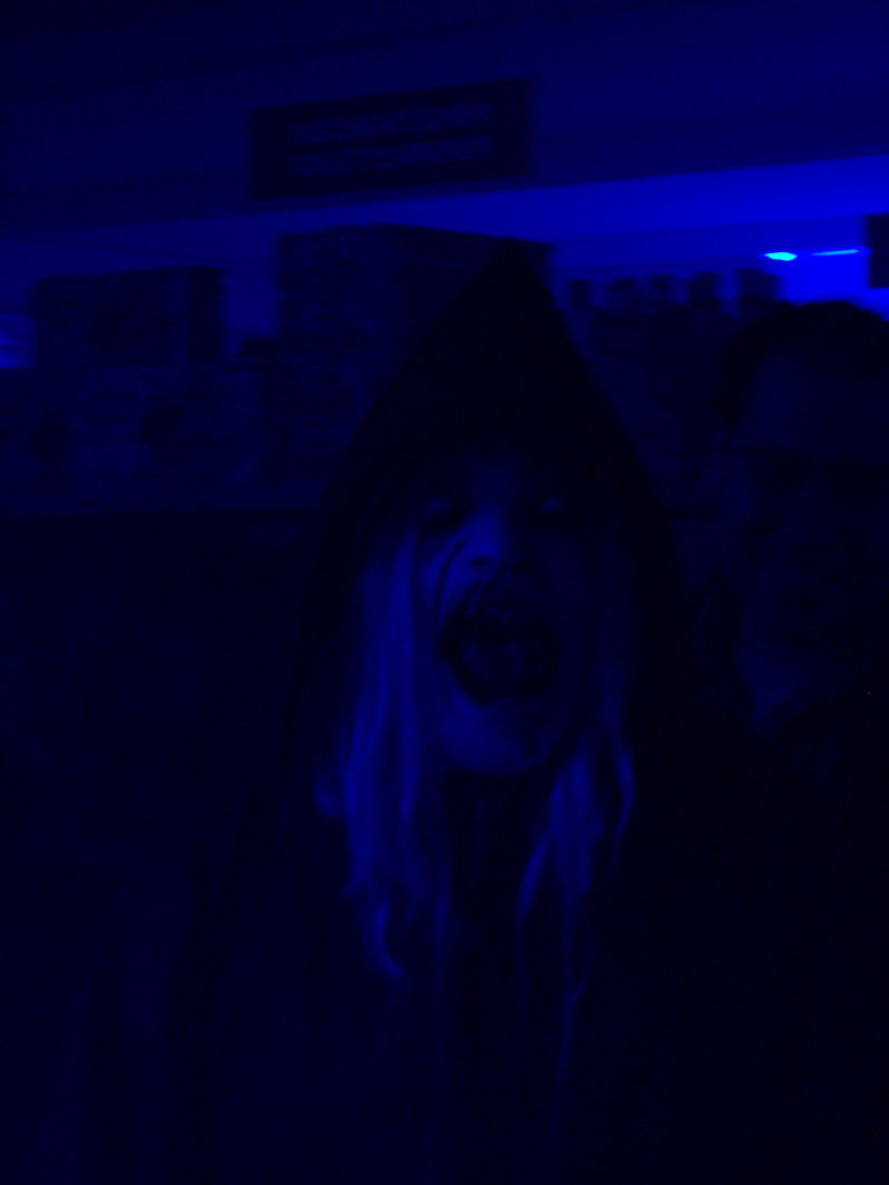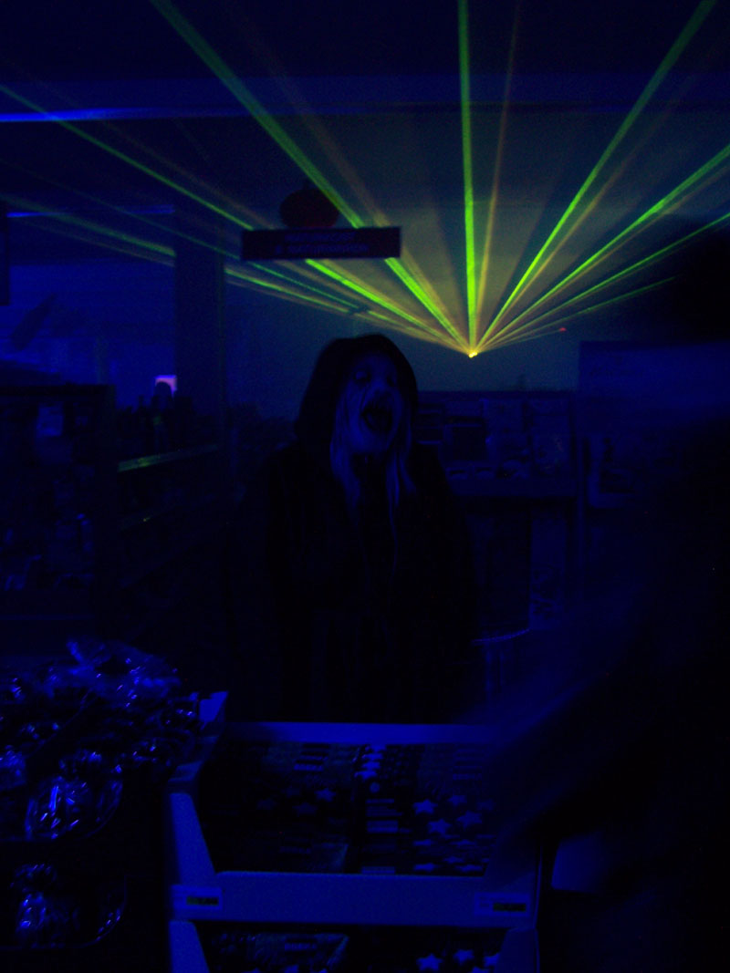 Dann hatten wir eine halbe Stunde Zeit, den Laden umzugestalten. Vieles war zwar schon vorbereitet, aber da wir natürlich bis halb Neun einen reibungslosen Ablauf gewährleisten wollten, war noch nicht allzuviel möglich. Die Deckenbeleuchtung wurde im Grunde komplett abgeschaltet. Kühlmöbel blieben dunkel. Die einzige Beleuchtung waren zwei kleine Scheinwerfer für die Kassenarbeitsplätze, fünf blaue (kein Schwarzlicht) Leuchtstoffröhren an der Decke, vier Schwarzlichtröhren im Kühlregal (Wer hätte es gedacht...), rot-gelbes Flackerlicht über/hinter dem Kühlregal, dass die "Hölle" darstellen sollte und ein RGB-Laser, der nur in einer Ebene arbeitete und so Farbfächer und ähnliche Muster projizierte.