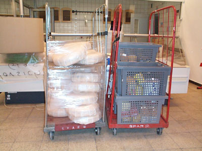 Dass wir uns dem Ende der Umbauarbeiten und damit der Eröffnung nähern, ist auf diesem Bild zu erkennen. Die ersten Frischeprodukte wurden geliefert, in diesem Fall Käselaibe für die Bedienungstheke.