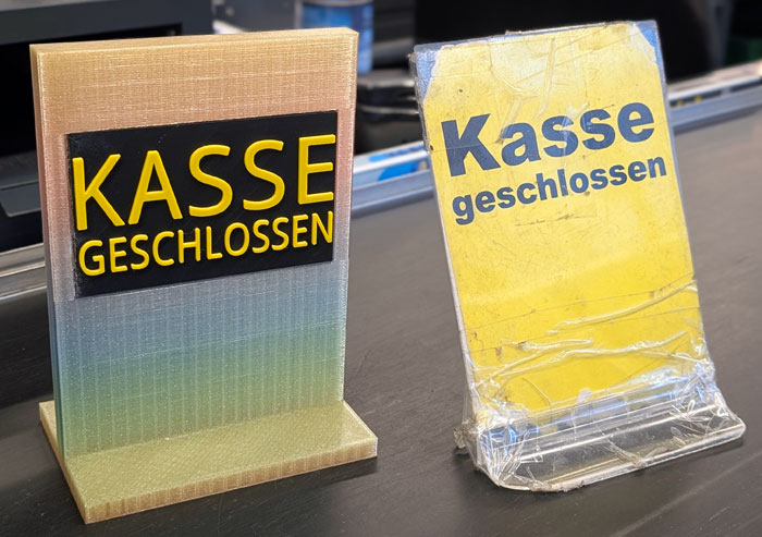 Vor sieben Jahren hatte ich von Alexander ein 3D-gedrucktes "Kasse geschlossen"-Schild bekommen. Das Teil wollte ich nie an der Kasse verheizen und so steht es seitdem hier bei mir im Büro als Dekoration herum. Aus der Zeit (oder war Alexander erst durch mein neues Schild inspiriert worden), stammte auch der (zweite) Speisekartenhalter, der nun auch viele Jahre einen guten und erfolgreichen Job hier an der Kasse gemacht hat.