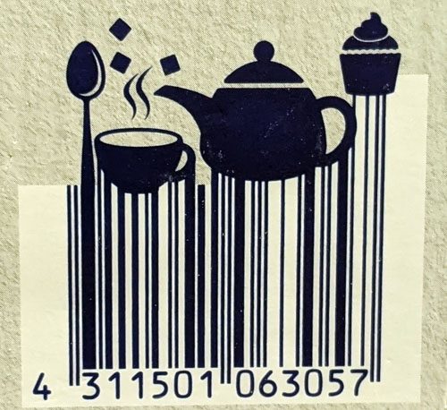 Auf den großen Paketen Würfelzucker unserer Eigenmarke war uns dieser Strichcode aufgefallen, auf dem ein Muffin (oder Cupcake?), eine Teekanne mit -Tasse und -Löffel (obwohl der von der Größe her eher ein Esslöffel sein könnte (oder die Tasse ist ein Puppentässchen)) und natürlich ein paar Zuckerwürfel befinden: