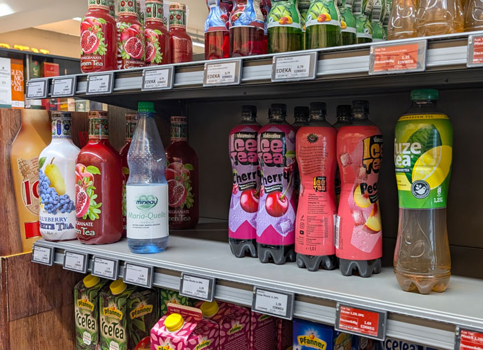 Für wahrscheinlicher halte ich, dass ein Mitarbeiter oder eine Mitarbeiterin des Geschäfts sich zur Erfrischung während der Arbeit eine Flasche mit auf die Verkaufsfläche genommen und dort dann später vergessen hat. Ich will nicht sagen, dass sowas bei uns nicht auch vorkommt. Es gab sogar mal eine Zeit, in der man hier ständig mehr oder weniger volle Red-Bull-Dosen in den Regalen finden konnte – aber das ist inzwischen lange her …