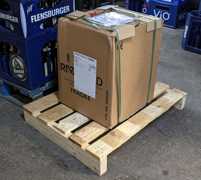 Vorhin hat eine Spedition diese kleine Palette abgeliefert. Der Karton enthält laut Lieferschein einen Verdichter. Juhu, so weit haben wir es also immerhin schon geschafft.