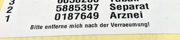 Transportmittelaufkleber unserer Großhandlung. Dass wir in den Läden die Aufkleber entfernen sollen, da dies den Workflow im automatisierten Lager erleichtert, wissen wir schon seit Jahren.