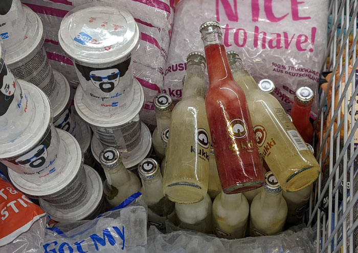 Ja, in der Tiefkühltruhe! Die Flaschen werden mit der TK-Ware ausgeliefert, der Inhalt ist gefroren und sie werden auch tiefgekühlt verkauft. Das funktioniert, weil der Inhalt eingefroren wird, bevor der Kronkorken auf die Flasche kommt. (Darum steht wohl auch auf den Flaschen, dass man sie nach dem Auftauen nicht wieder einfrieren soll, das könnte Scherben und unnötige Sauerei im heimischen Tiefkühlschrank verursachen.)